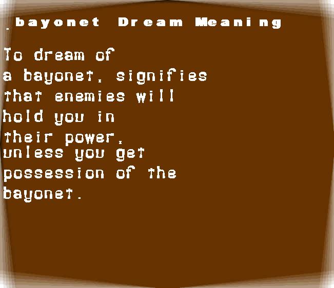 | . To dream of a bayonet, signifies that enemies will hold you in their power, unless you get possession of the bayonet. |